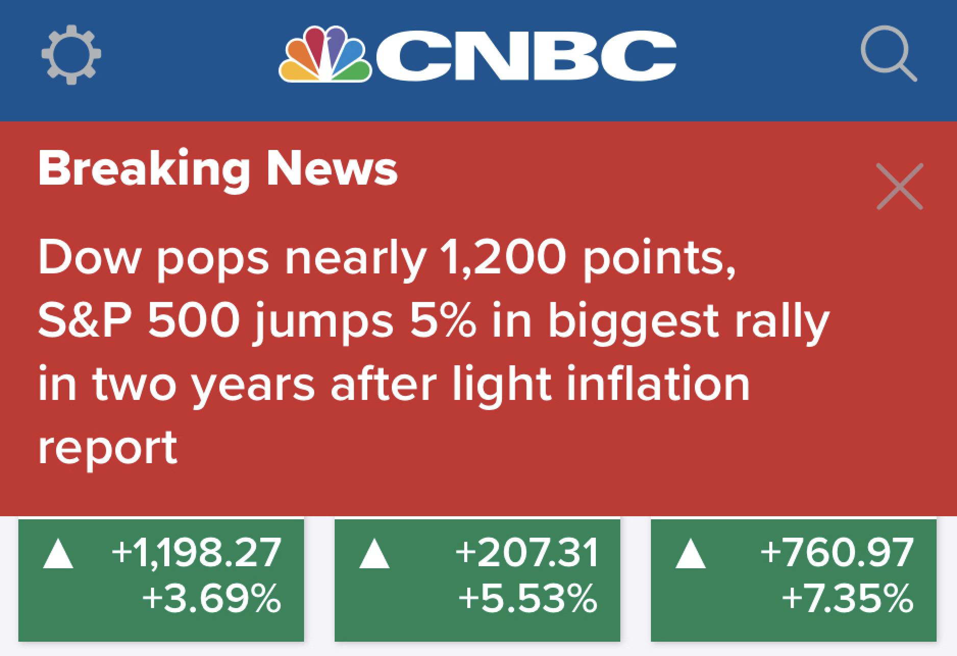 It’s above my pay grade to predict if this bear market is over and if there has been enough damage to markets and sentiment. What I do know is, when narratives get one-sided and skew to that narrative gets extreme, even a tiny catalyst that’s unexpected can make everyone, including the computers, run for the exits all at once. We had a slightly better than expected CPI print last week which was received as a positive for asset prices, negative for the dollar and interest rates because weakening data could keep the Fed from staying on its most aggressive path to fighting inflation. None of us know what this path will be but sometimes, just a little spark is needed to get a selling strike, wicked short covering, and a buying frenzy all at once. And this is what the end of the day looked like. I’ll take more of these please.