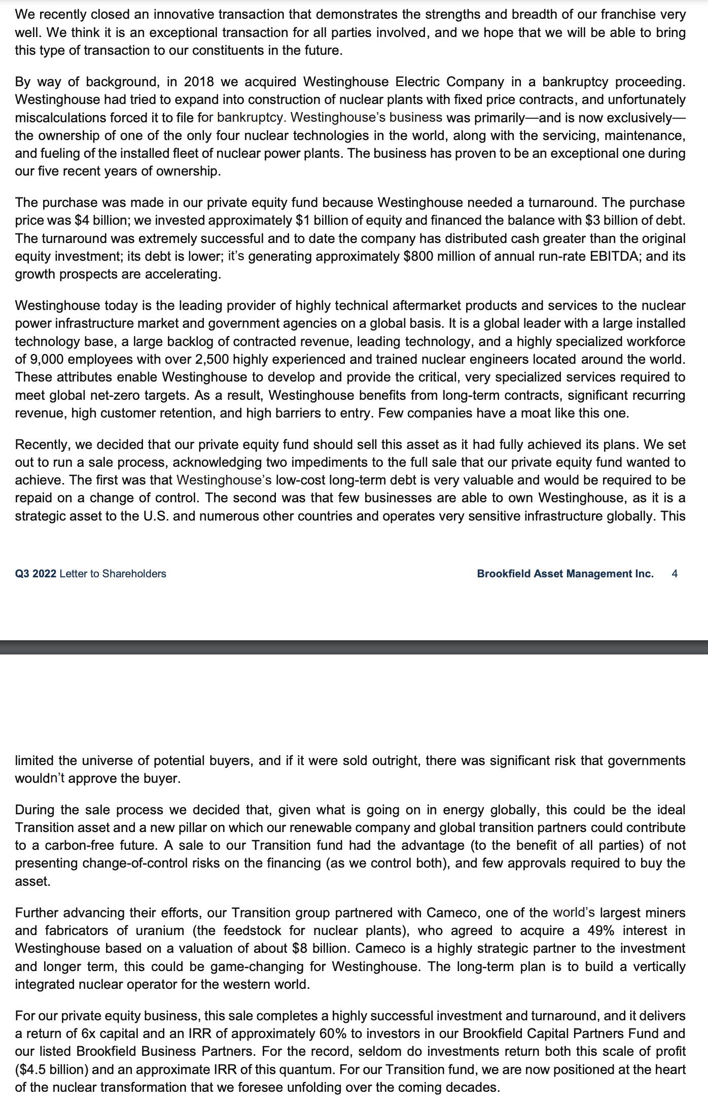 From todays earnings call, here’s yet another example of their superior investment acumen. Westinghouse, a former darling, filed for BK, BAM came in, added significant investments, turned the business around, get it growing again and it’s now in-line to win big from massive global infrastructure spend on renewables and nuclear. Great read here. They invested $4 billion initially in 2018, added another $1B plus $3B of debt financing and just transferred the asset to another one of their funds paying $8B and offering a 6x return to their PE business and 60% CAGR IRR for investors. That’s how the best investors do it!