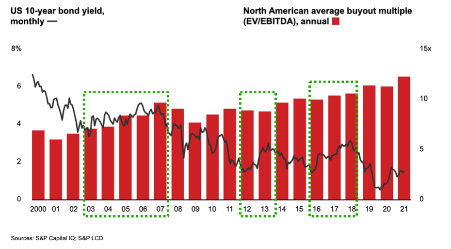 I looked back at deal multiples for PE industry, lets assume falling rates & easy fed=tailwinds for multiples -rising=headwinds. I would expect multiples to fall given rapid rise in rates in 2022 but history shows the multiples didn’t change that much. $BX $KKR. Rising periods green-boxed