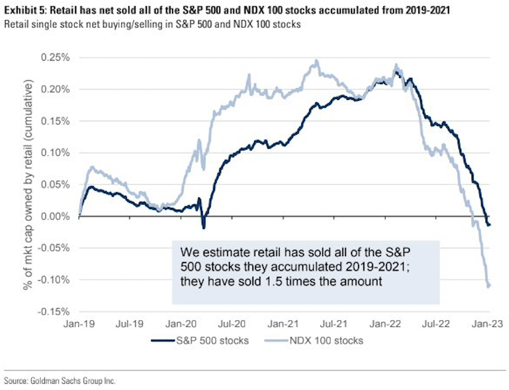 Chart #3: Redemptions have been enormous over the last 90 days. This chart from Goldman shows retail investors have net sold all of the S&P 500 and Nasdaq stocks they bought from 2019-2021, that’s alot of selling and a lot of new buying power at some point folks.