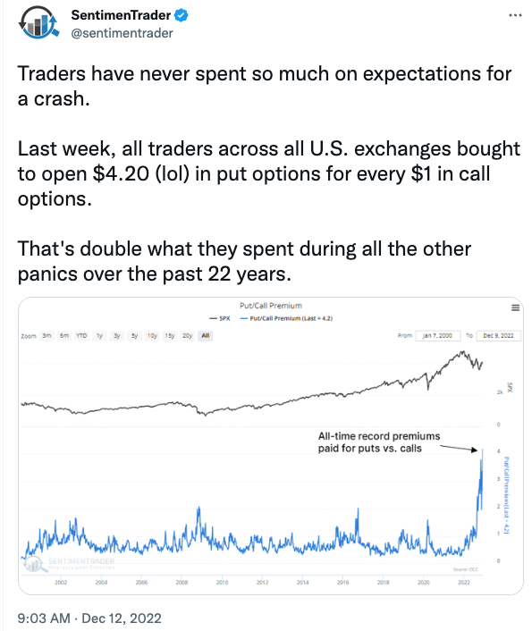 The bear case for stocks seems very well known in my opinion. High inflation, lingering for longer, a Fed that continues to hurt more than it helps, earnings & margin deterioration as the effect of tight financial conditions works its way into corporate and consumer spending, etc. There can always be new problems that arise: consumer spending slows further as food and rent costs eat further into savings and wage pressures & lack of skilled labor pinch corporate balance sheets, or credit markets seize up further. Because we live in a algo-driven world and stock market, any headlines can and will be used to drive short term directions. From my perch, however, it seems like the bear case is widely known and allocated for and the market is heavily leaning in the bear direction, low volume holiday rallies not withstanding. What happens when/if things do not stay as bad or simply get slightly better than really bad? Often, the best gains happen when things go from horrendous to slightly less horrendous. And with such bearish positioning and sentiment, any hint of good news will force bears to position for a slightly less bearish outcome and thats a lof of money running through a very narrow door. I do not know when this will happen but I feel confident we have a period sometime in the next year where a seller strike drive a wicked rally that most do not expect. We shall see.