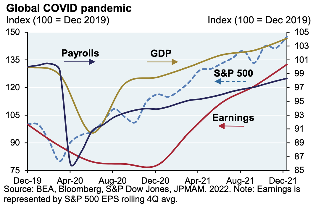 In this example: We do not know if markets have yet to make their final bottom but there’s already been major damage to sentiment and equity prices. Valuations have been re-set. Earnings began to ease in Q1 of this year, payrolls have not begun to fall but with layoff announcements, we should see that next. GDP peaked about the same time as earnings.