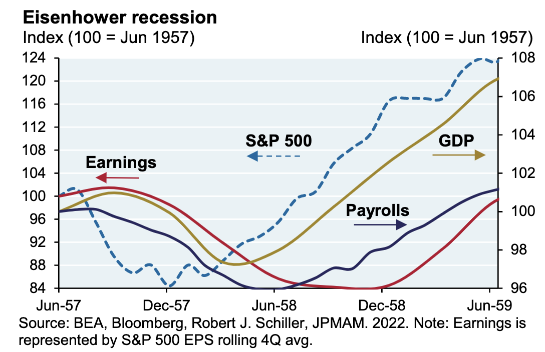 Since we know we can’t predict the future with anything better than 50/50 odds, let’s look at some former bear market periods as examples of this thesis to see if we can spot any patterns that help better our odds of understanding the future. These charts came from a recent JPM “Eye on the Market” report from Michael Cembalest, a very good strategist. I’ll cut to the conclusion for those that don’t want the history lesson. Here’s what Cembalest says about our market today and the potential bottom in stocks: