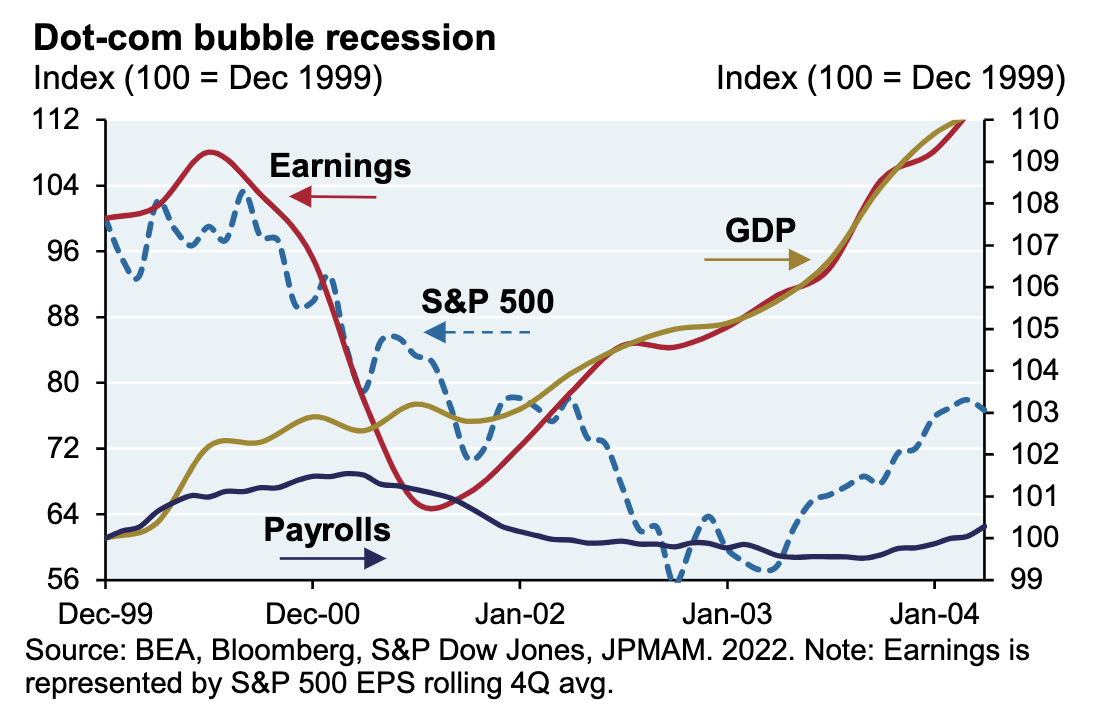 Here, I’ll quote Cembalest: The Dotcom collapse is the outlier: “the earnings decline preceded the equity market decline, there was barely a recession at all, and the mini-recession of 0.3% preceded the equity market bottom by more than a year.”