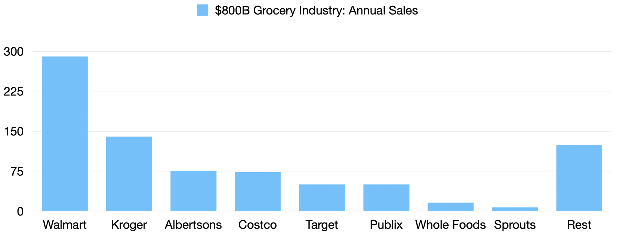 The U.S. grocery business is an $800 billion a year industry. The industry is dominated by big box retailers and a handful undifferentiated national and regional grocery chains.